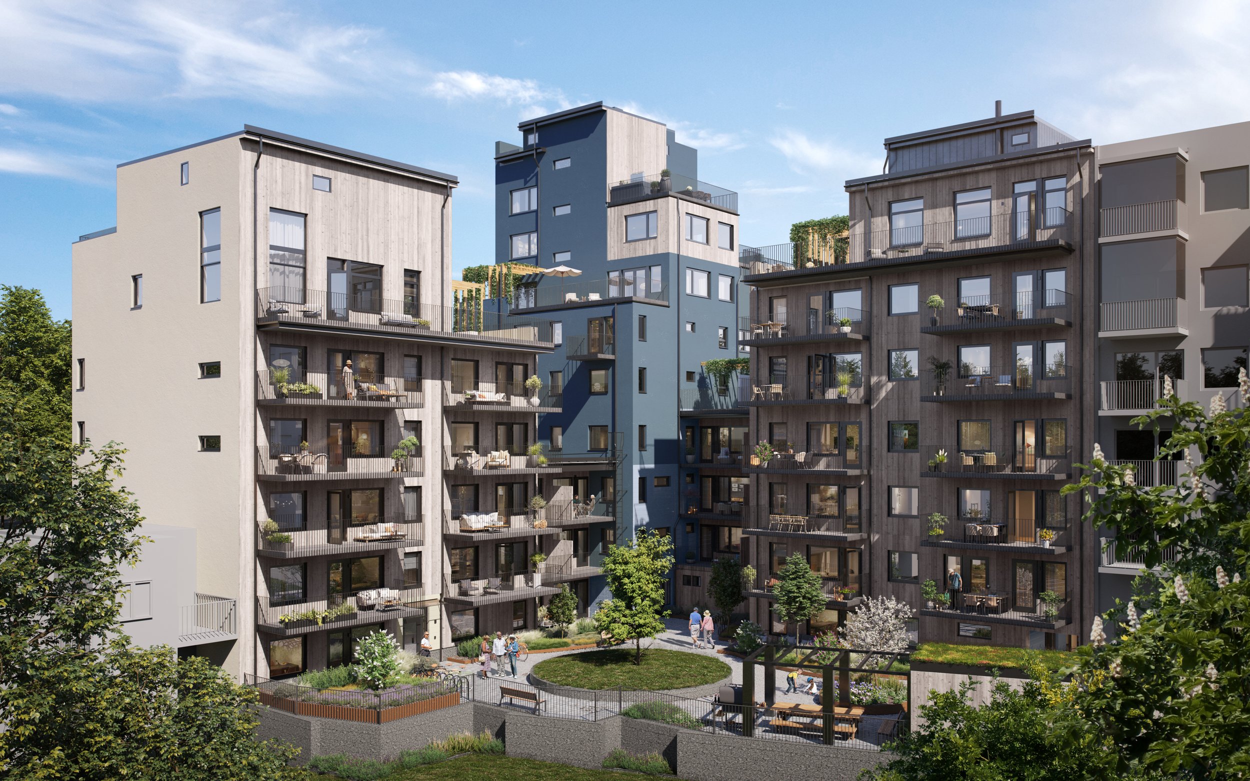 Blå Tornet är egentligen inte ett hus utan tre huskroppar med varierande våningsantal som binds samman av mindre byggnader. Resultatet är vacker arkitektur som man kan vara stolt över. På det här sättet får man också bästa förutsättningar för rikligt med ljus och vackra vyer.